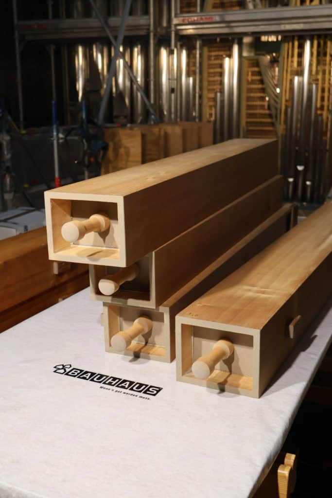 Le chantier progresse : les tuyaux en bois ont eux aussi été déposés. Contrairement à une idée reçue, l’orgue Metzler ne se compose pas uniquement de métal. Ces éléments en bois – visibles ici – font pleinement partie de l’instrument et rejoignent, comme les autres, l’atelier installé sur l’échafaudage, en vue de leur restauration.