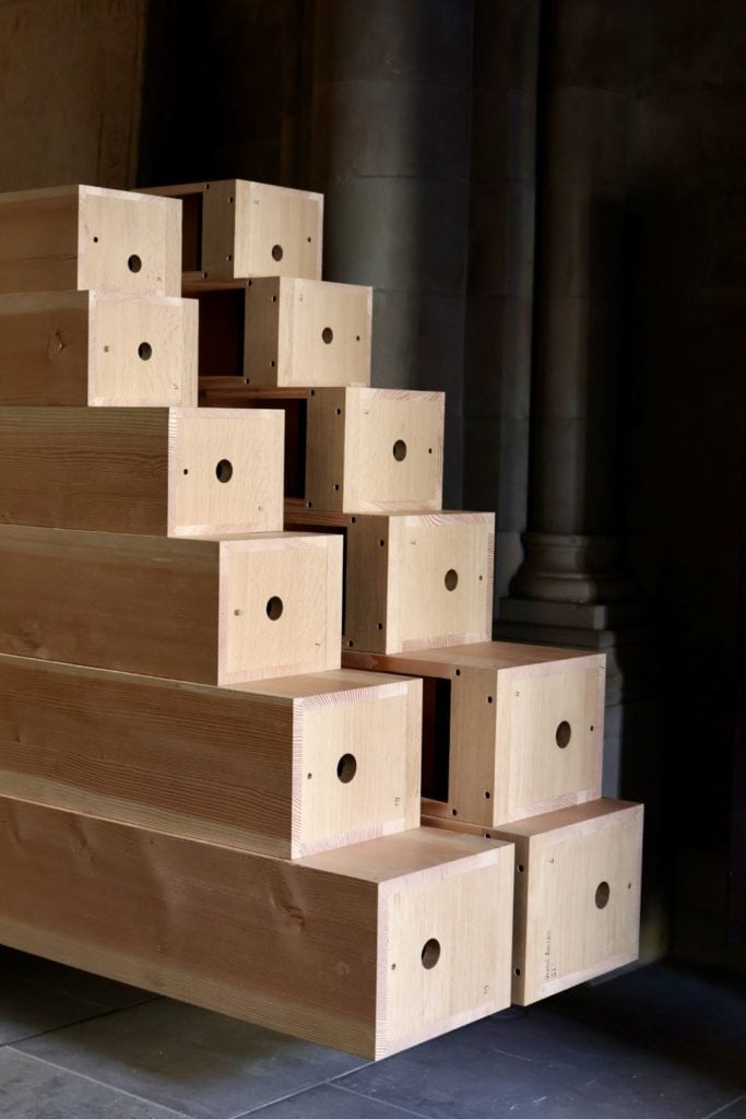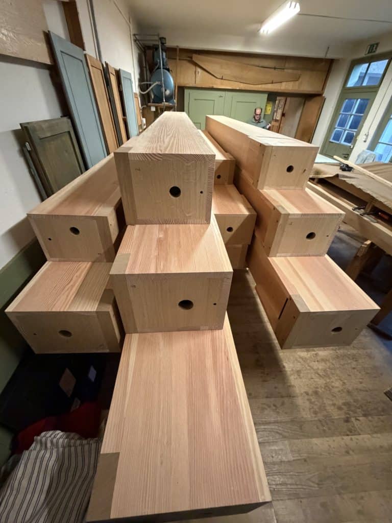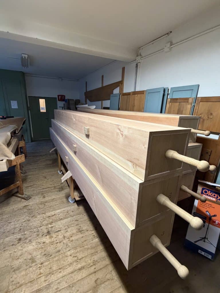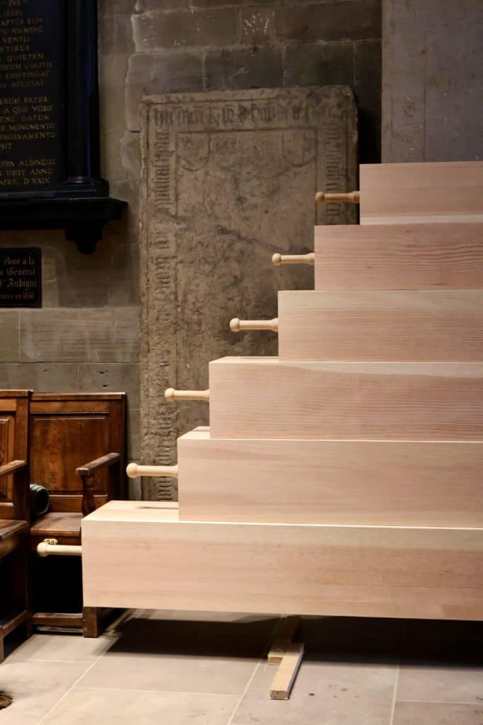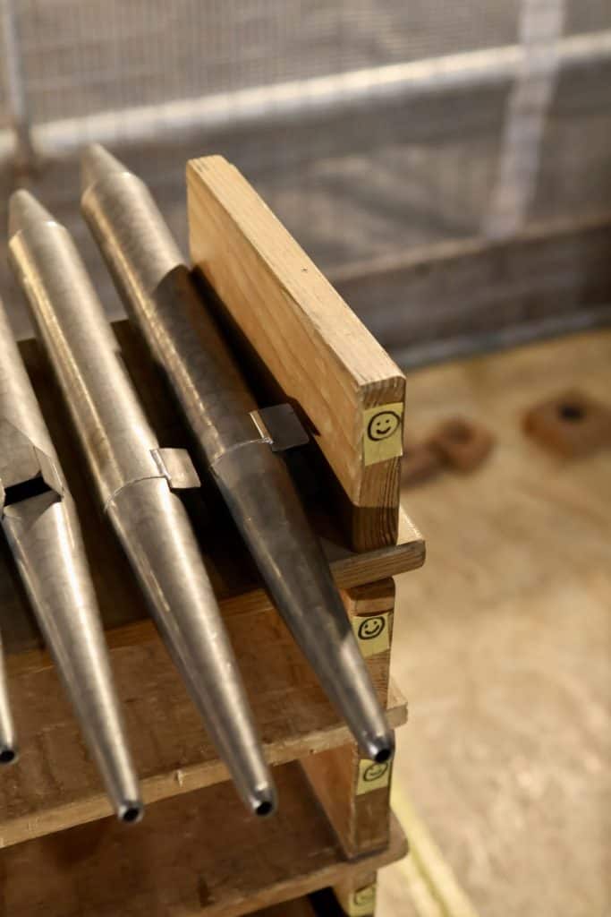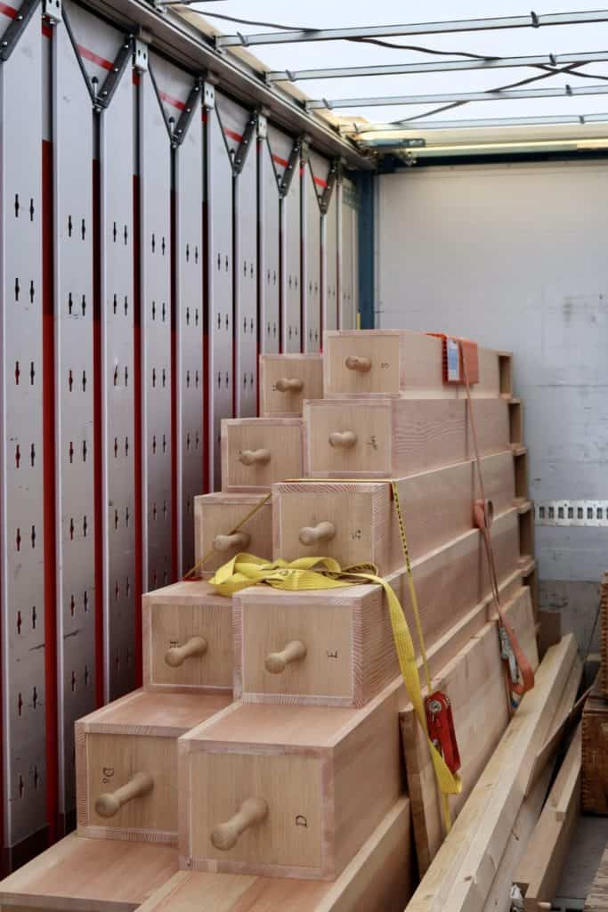 Parmi eux, une nouvelle octave de Soubasse 32 pieds – ces grands tuyaux en bois visibles ici – ainsi que différentes pièces de menuiserie du buffet, réalisées en pin Douglas. Les plus grands de ces tuyaux dépassent 100 kg, ce qui a nécessité une manutention particulièrement attentive lors du déchargement. Un moment marquant du chantier, accompagné des effluves du bois fraîchement travaillé.